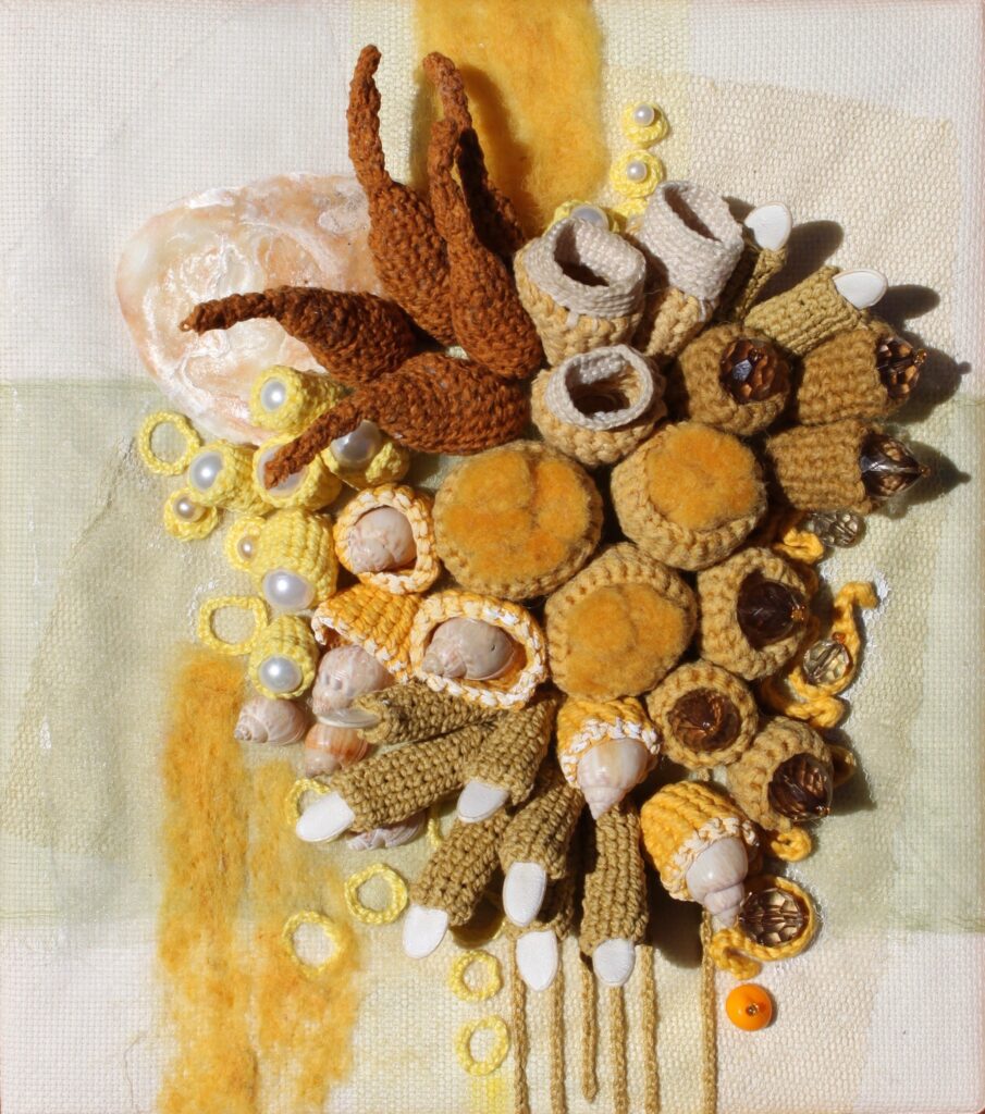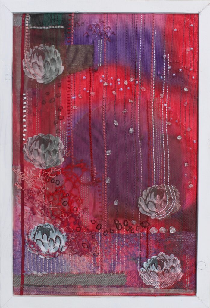 Textiel, ruw, glad, verfijnd, grof. Texturen, Textiel, ruw, glad, verfijnd, grof. Texturen, het voelen, het tasten. N.a.v. van waarnemingen schept ze haar beeldend textiel. Ze borduurt, schildert, vouwt, rangschikt en voegt niet textiele materialen toe op klein formaat. Het trage proces van het bewerken van textiel is wat haar aantrekt. het voelen, het tasten. N.a.v. van waarnemingen schept ze haar beeldend textiel. Ze borduurt, schildert, vouwt, rangschikt en voegt niet textiele materialen toe op klein formaat. Het trage proces van het bewerken van textiel is wat haar aantrekt.
