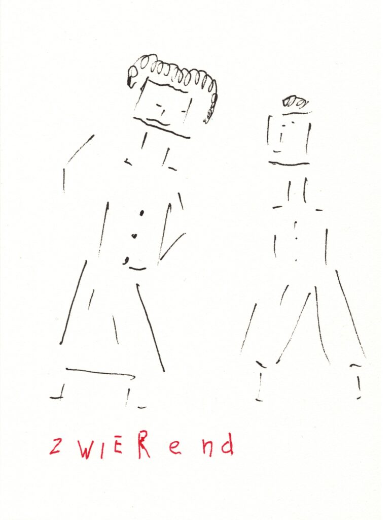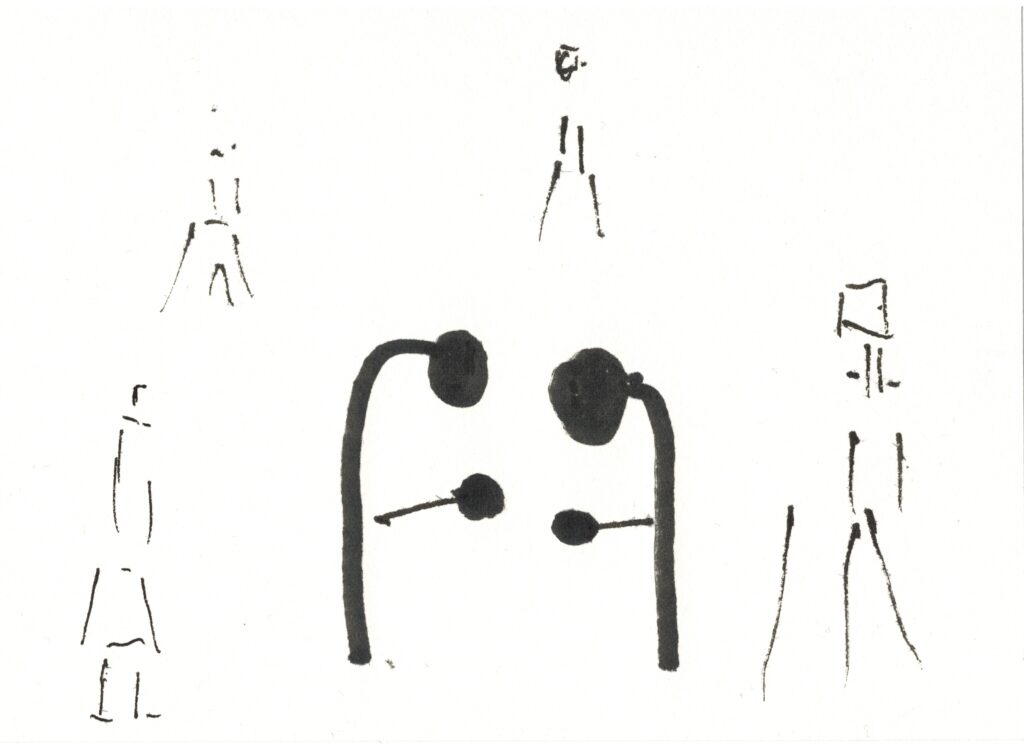 Mijn inkttekeningen komen ongezien tot stand. Ik maak vooral een schets in mijn hoofd. De tekeningen hebben een springerig en ritmisch karakter. De inhoud is verhalend en de mensfiguren zijn abstract.