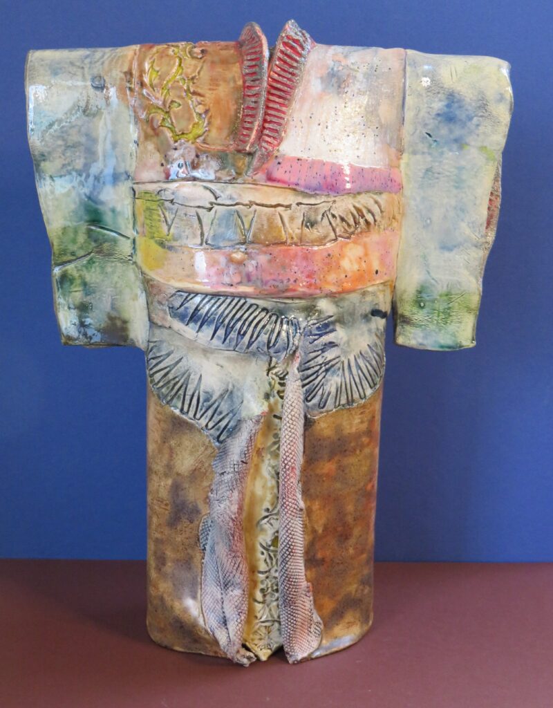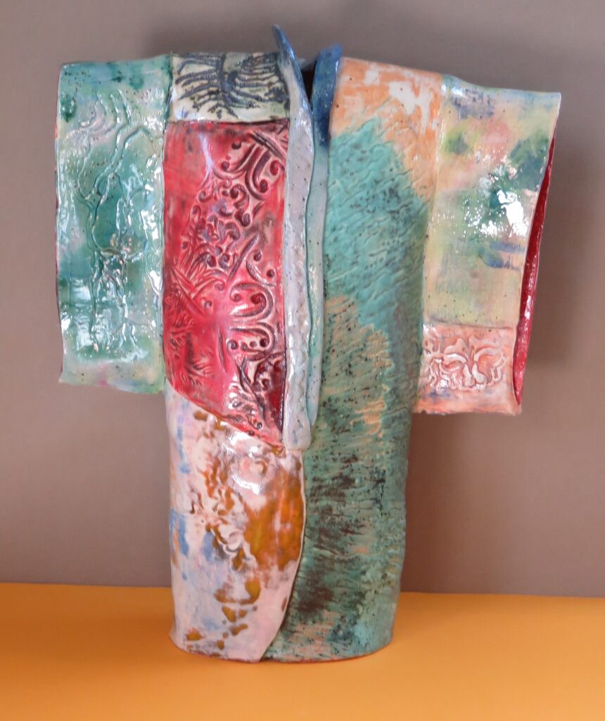 Als keramist voel ik mij vormgever in mijn eigen taal. Als schilder voel ik mij vrij om te experimenteren. Dit komt samen in mijn werk: structuren, kleur en gelaagdheid. Mijn jarenlange ervaring biedt mij de kans om vrij te spelen met deze elementen. Zo ontstaat de gelaagdheid, die zo kenmerkend is voor mijn werk. In de basis is een (structuur) laag aangebracht in de biscuit scherf, die mijn fantasie stimuleert en tot oplossingen stimuleert. Hoogsels en diepsels zijn de basis van mijn structuren, aangebracht met natuurlijke en zelf gevonden materialen. Elke vondst stimuleert me weer opnieuw. Daarna werk ik met een wassing, een basislaag bestaande uit diverse onderglazuren en daarmee de structuren uitwerkend. Glazuur is de eindlaag. Een glasering van kleuren in keramiek, waar de verbeelding van verval, slijtage, sporen van gebruik tot hun uiting komen.