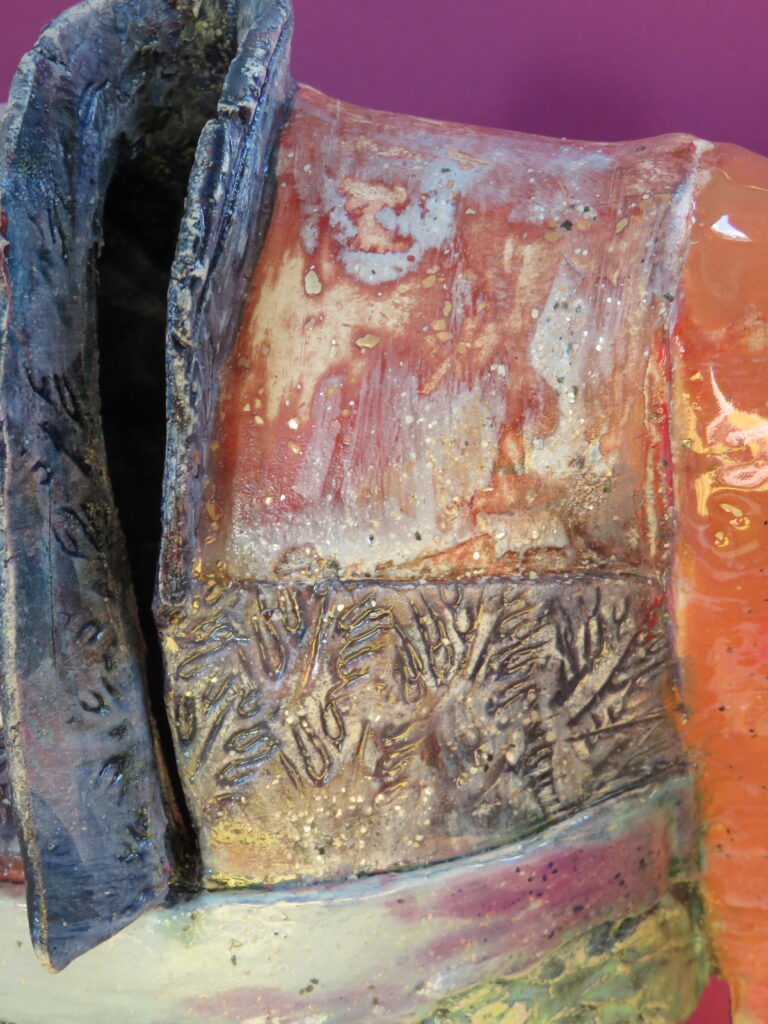 Keramiek blijft me uitdagen en verrassen. De mogelijkheden zijn zo divers. Dit laag gestookte aardewerk is mijn favoriet vooral door het werken met vuur. Deze manier van werken is intensief en vraagt veel tijd. Voor de decoratie kan je alles gebruiken, als ik langs het strand loopt neem ik b.v. zeewier mee. Staalwol of dun koperdraad geven ook prachtige effecten in deze manier van werken.