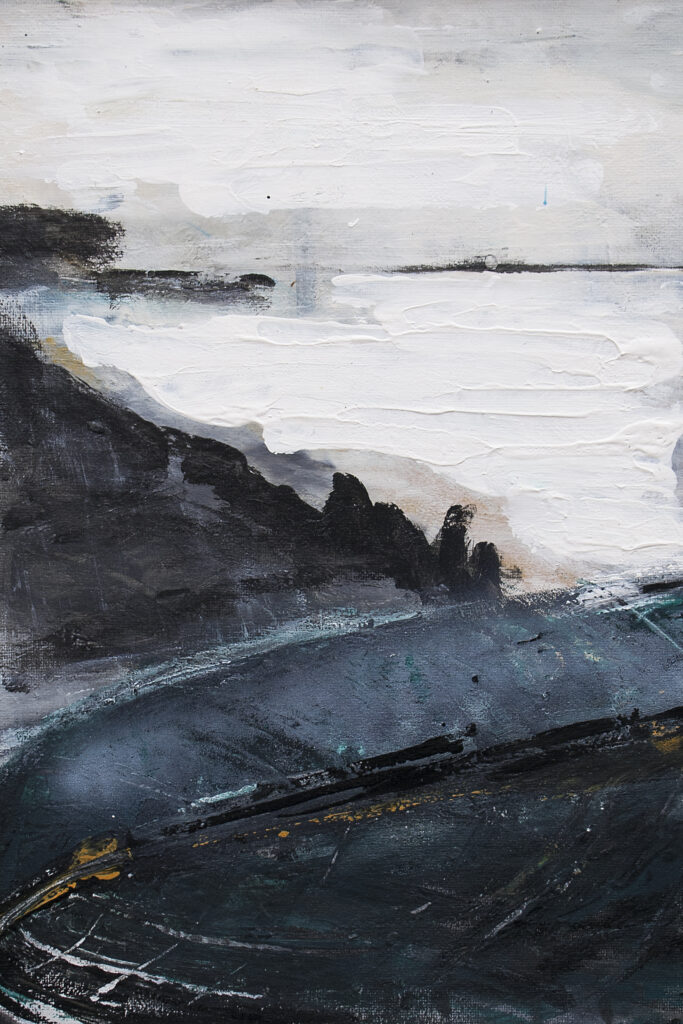 Corina’s hoofd is in dromenland. Had ze eerst connectie tussen ierde en loft, nu droomt ze dat ze met een vogel meevliegt en zwemt ze met een vis. In tekeningen en grafisch werk zoekt Corina vaste grond onder de voeten.